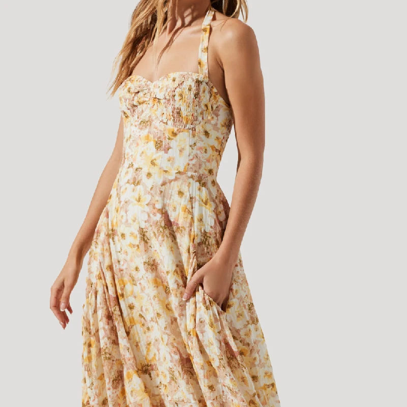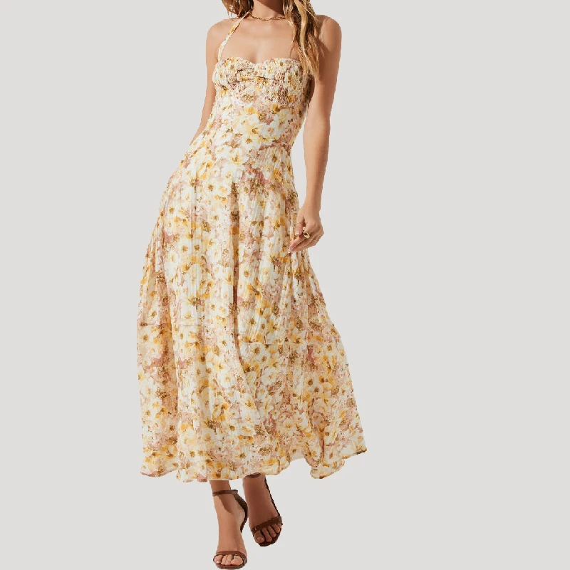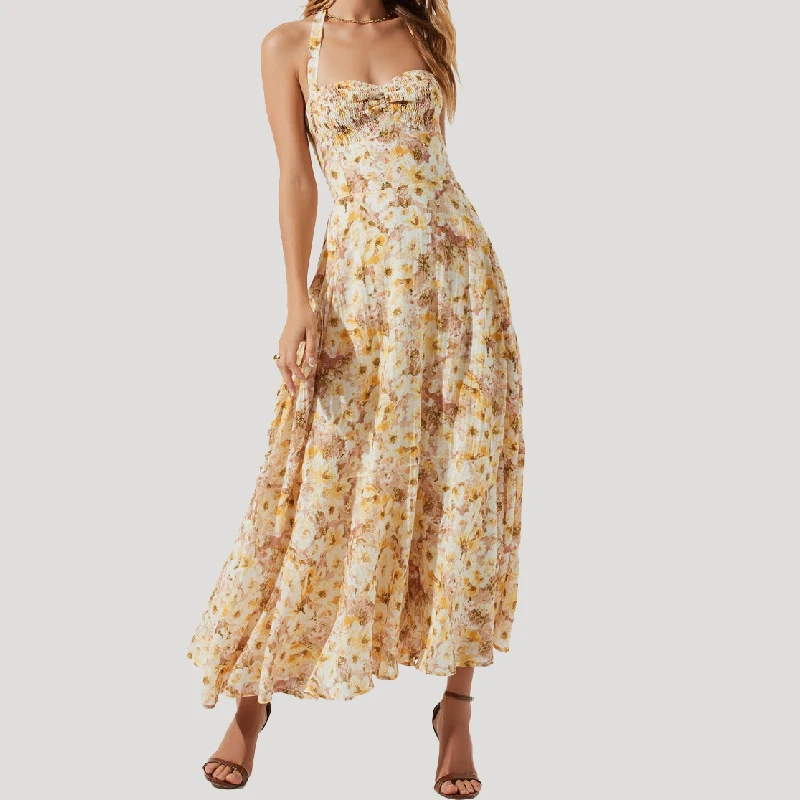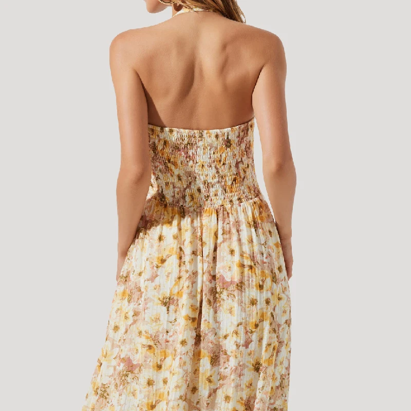 Casual Halter Neckline Backless Smocked Linen Floral Bohemian Bridesmaid Dresses for Summer Wedding